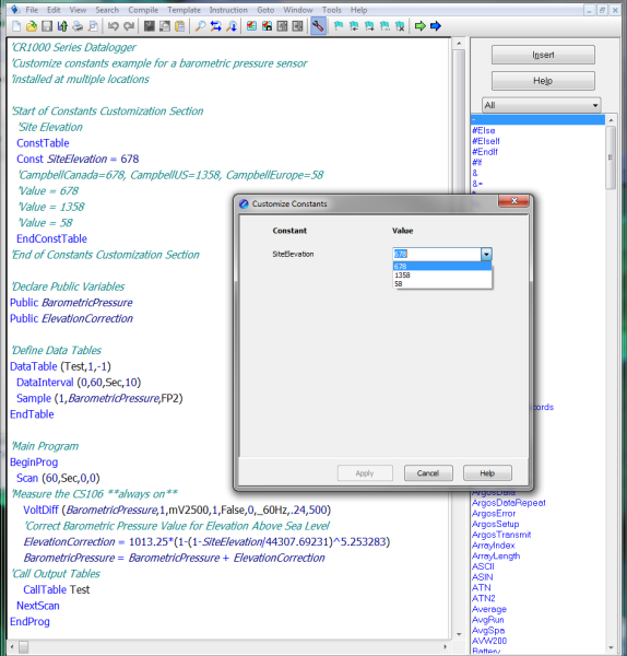 The following basic example demonstrates how you would use this for monitoring barometric pressure at multiple sites with different elevations. Before loading the program to your data logger you would select Tools – Customize Constants and select the correct elevation from the drop down menu. Then compile, save, and send.